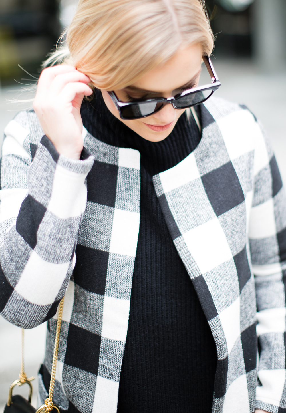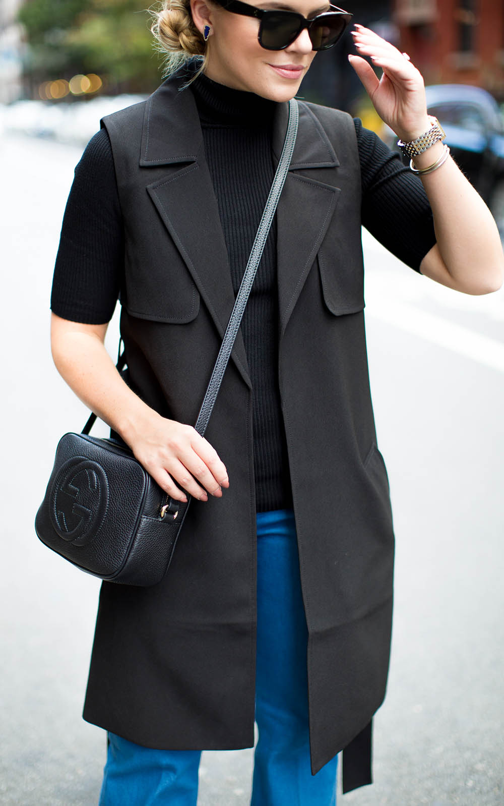My personal favorite – the sleeveless duster. I seriously can’t get enough of them! This black, tailored option with the turtleneck elevated the entire ensemble. It’s not overly complicated when you break down the look piece-by-piece, but put together there’s something ultra chic happening here. The same could be said if you were wearing a pencil skirt, skinny jeans, or even leather leggings on bottom.