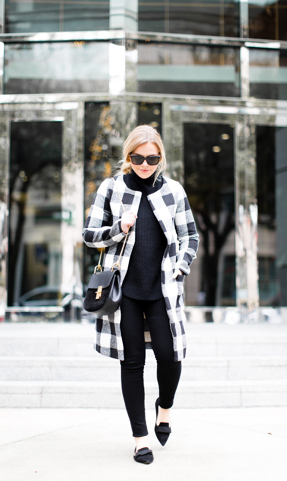 Jazz up your basic turtleneck top with a statement coat. I also like pairing this with black skinny jeans to keep the base of the outfit uniform, allowing the coat to pop!