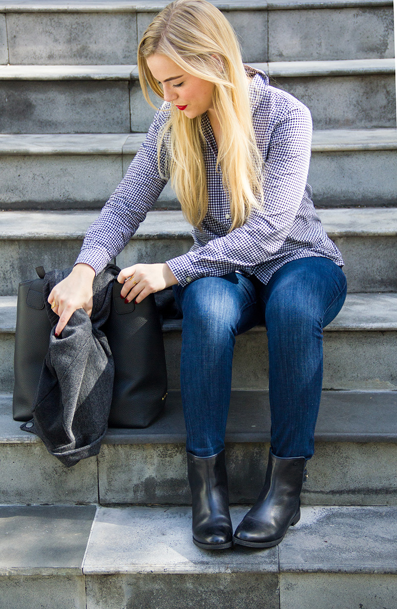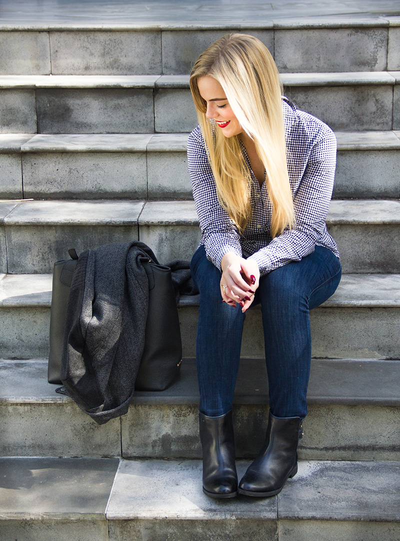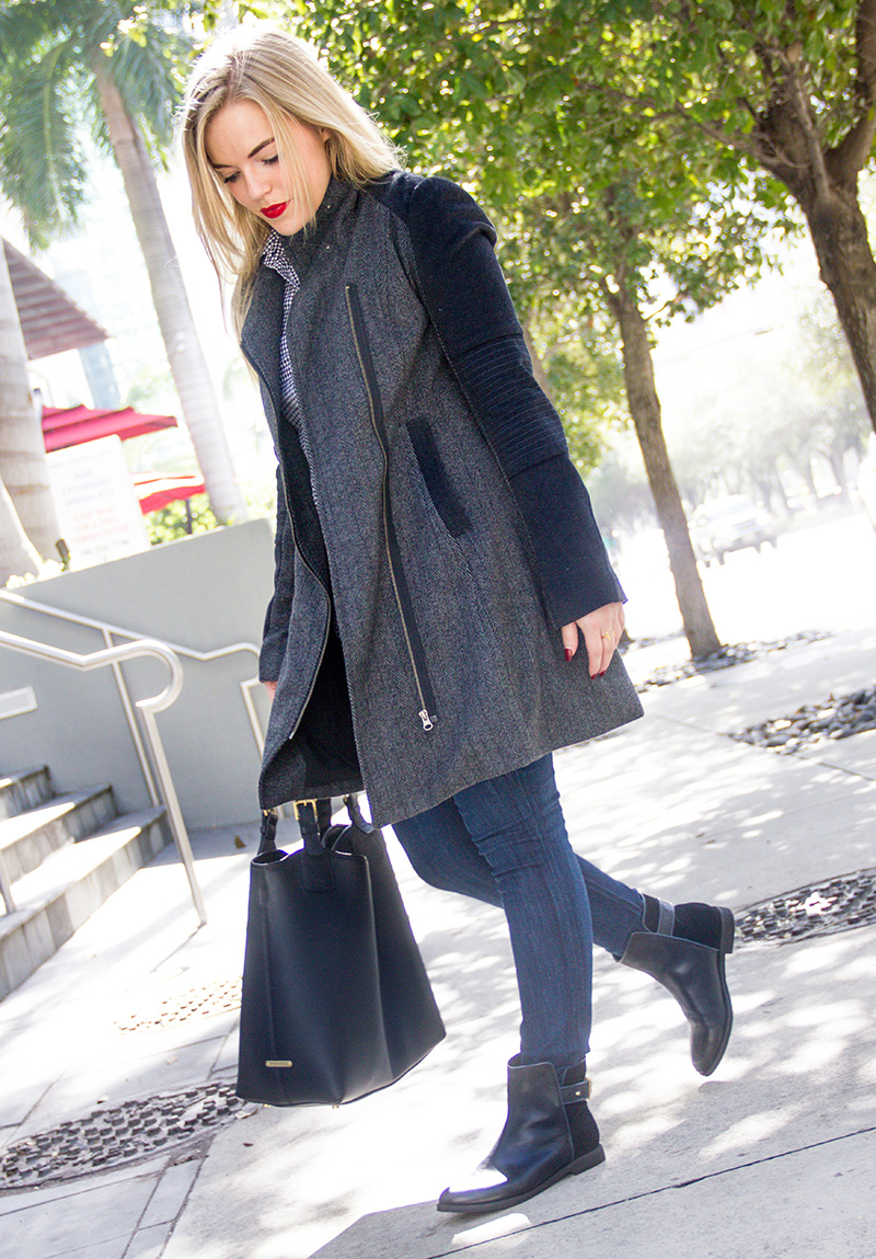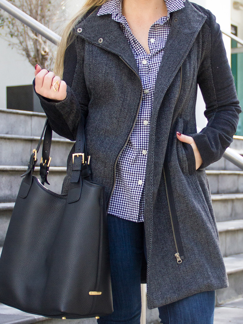 LAmade Coat c/o {another great asymmetrical option} | Gingham Button Down | Express Denim c/o | Lacoste Booties c/o | GiGi New York Handbag | Stila ‘beso’ Lips