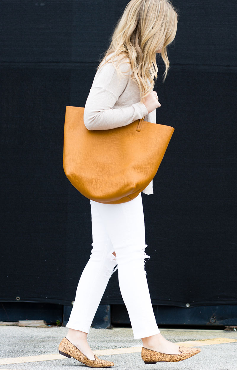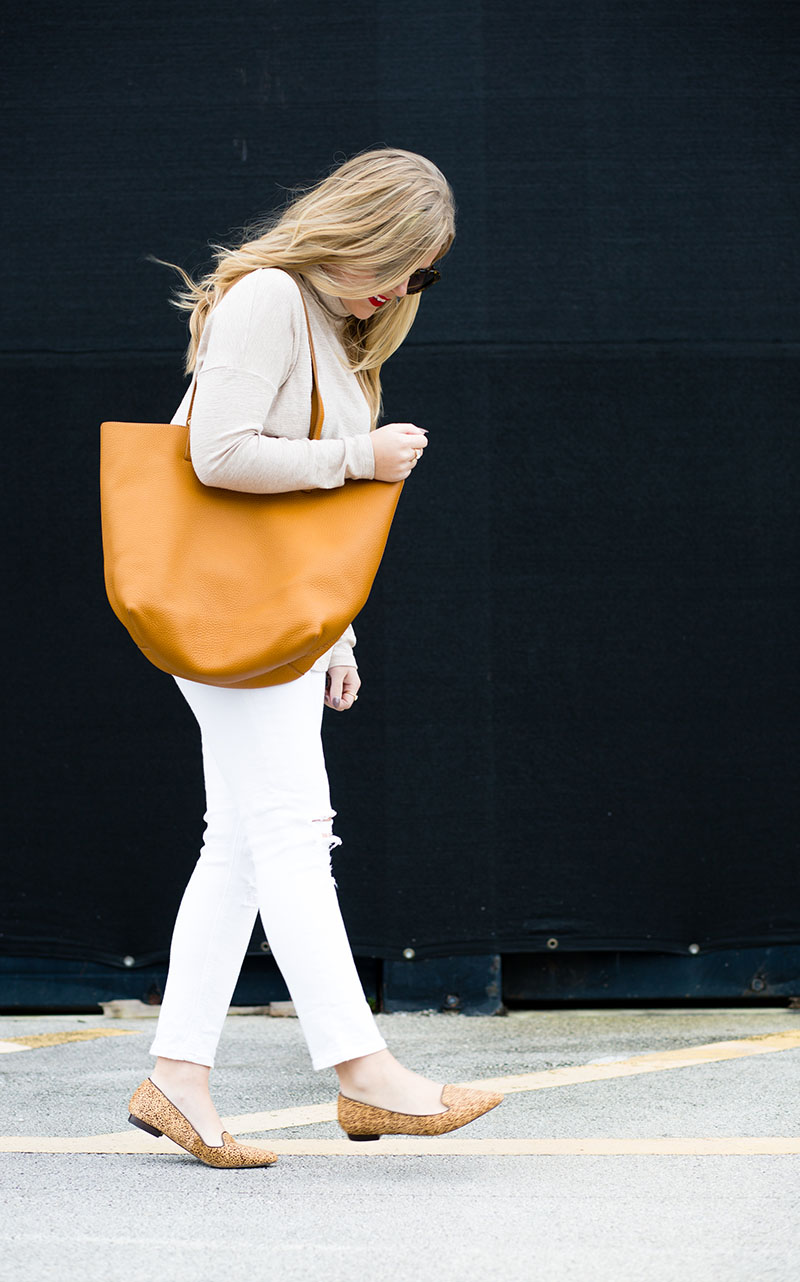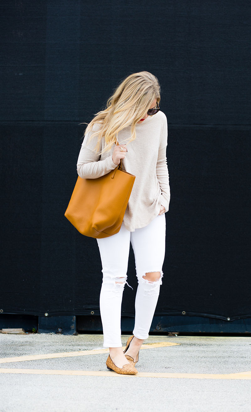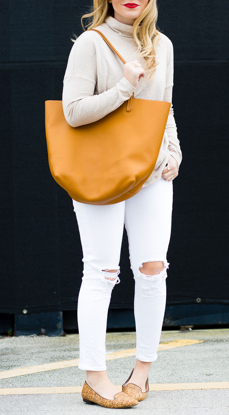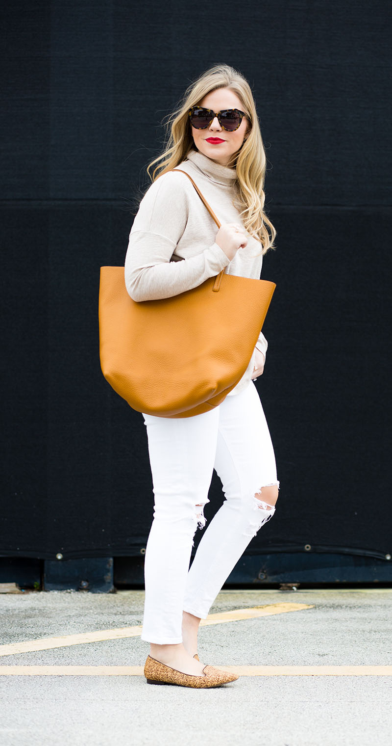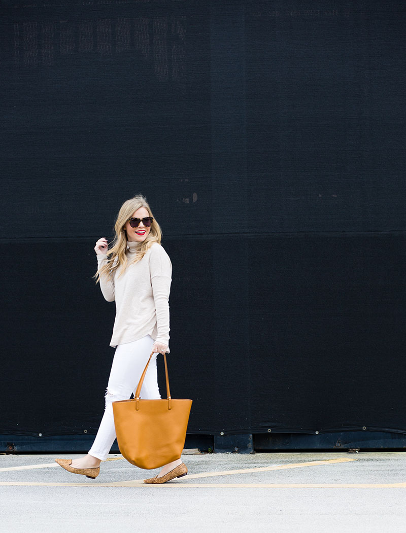 Lands’ End Turtleneck Tunic {exact color sold out, but still available in solids + prints} | White Distressed Skinny Jeans {further distressed by your’s truly} | similar Speckled Flats | GiGi New York Cognac Tote | Karen Walker Tortoise Sunnies | Stila ‘Fiery’ Lips