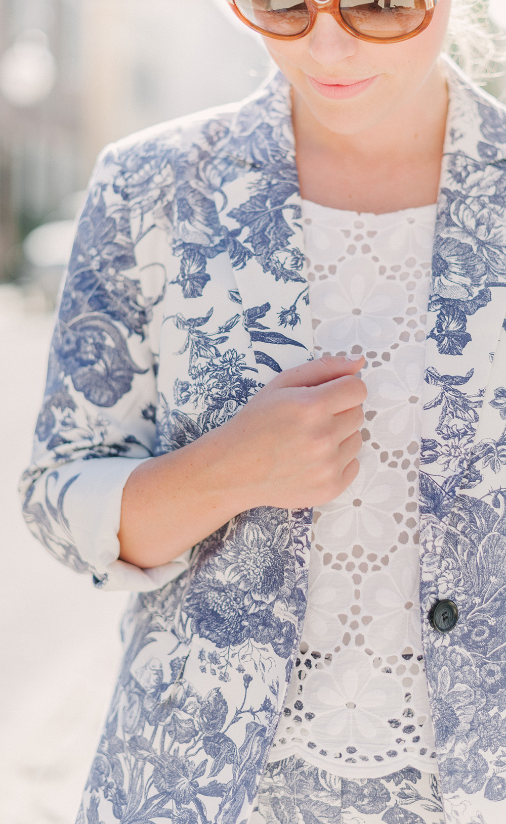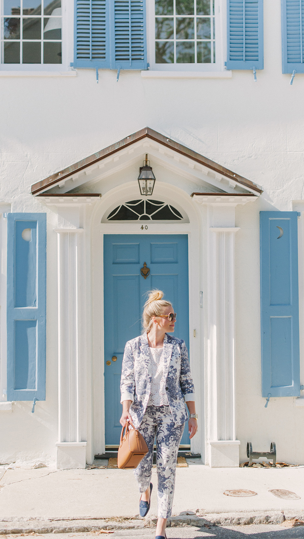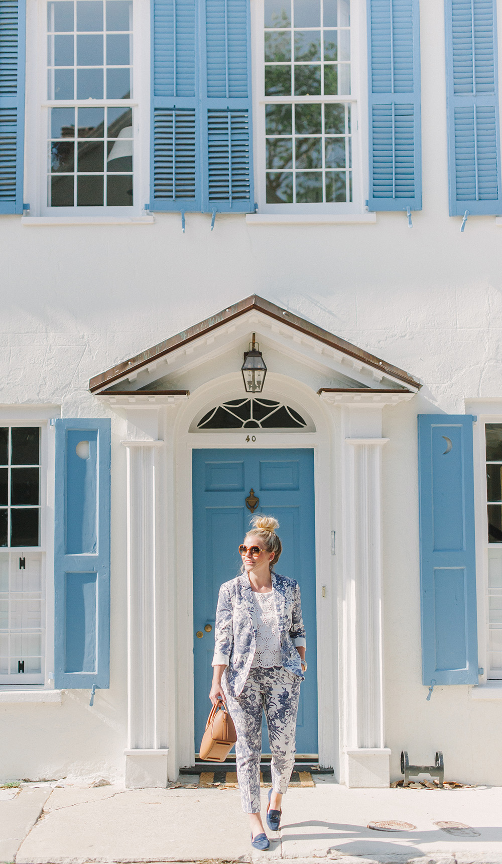 LOFT Blue Botanical Blazer {currently 40% off with code: OHGOODIE} | LOFT Blue Botanical Crop Pants {currently 40% off with code: OHGOODIE} | Givenchy Antigona Handbag | similar Round Sunglasses {+ only $24! mine are old Kate Spade} | Delman Loafers c/o {identical option in stock}