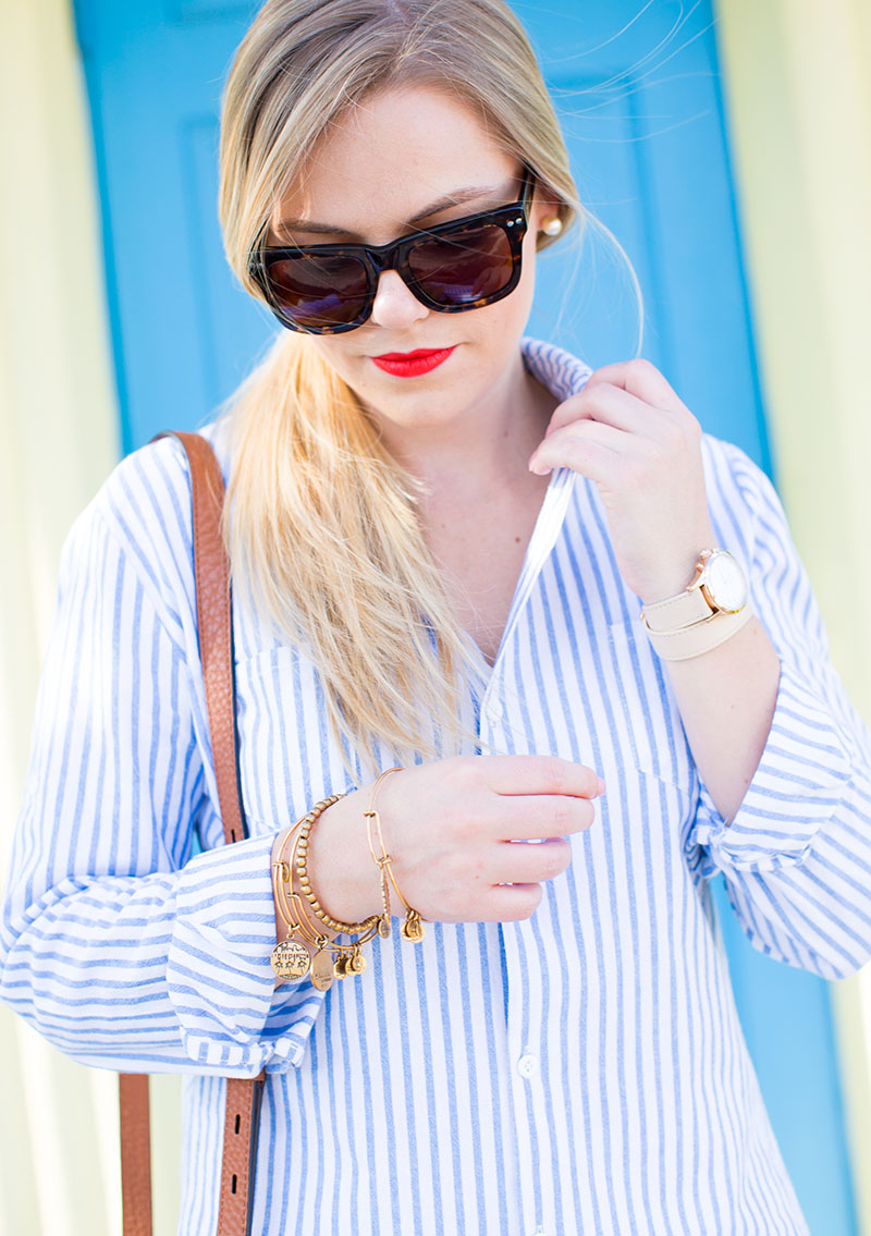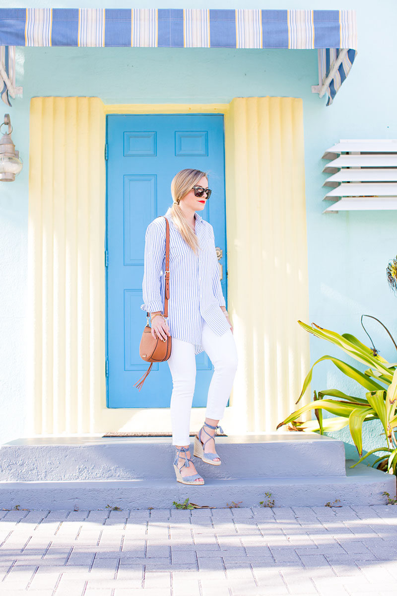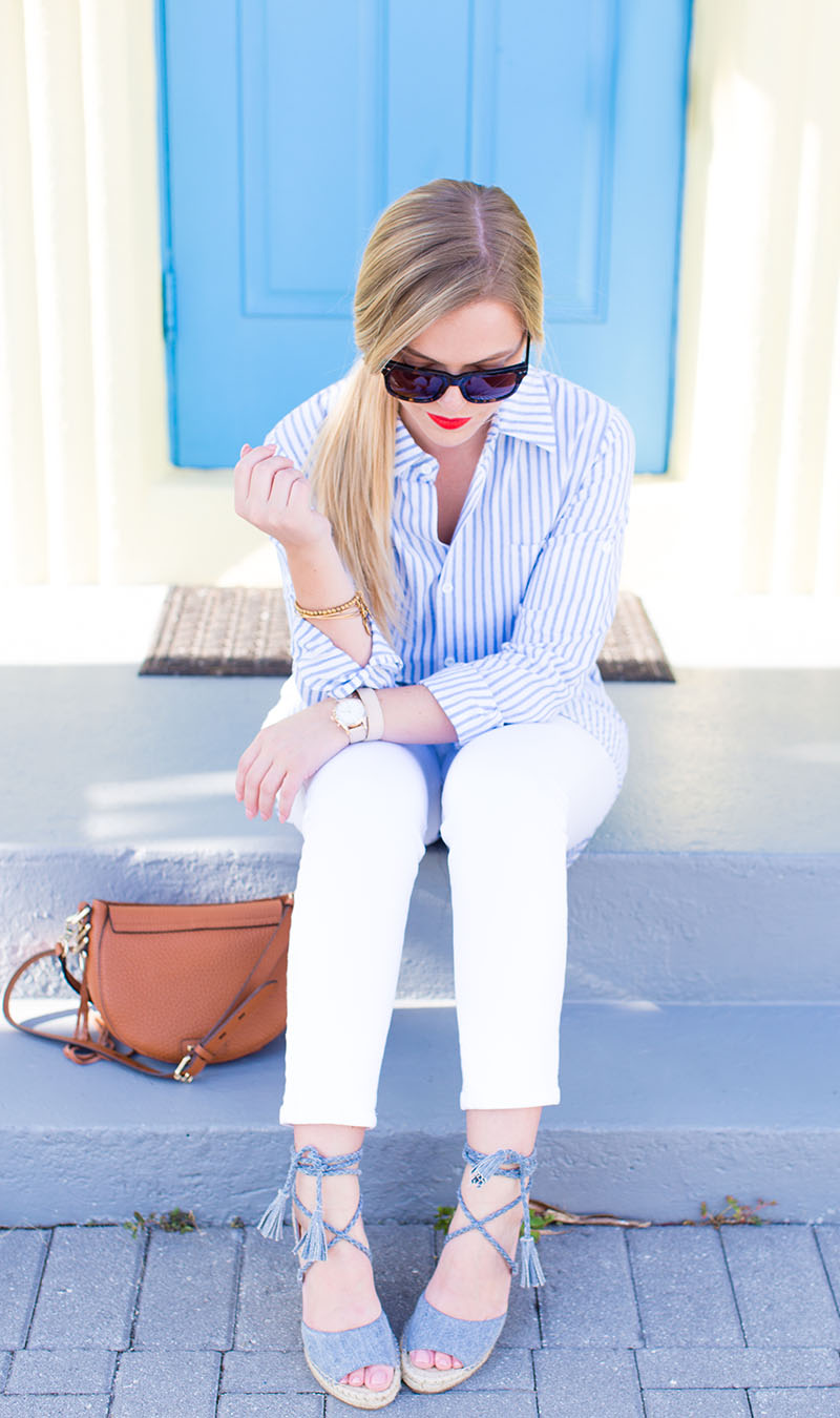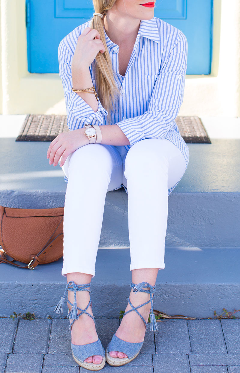 James Jeans White Crop Jeans c/o | Choies Blue Striped Button Down c/o | Joie Denim Wedges c/o {more sizes available here} | Rebecca Minkoff Crossbody {worn backwards} | Derek Lam Sunglasses | Alex + Ani Bracelet Stack