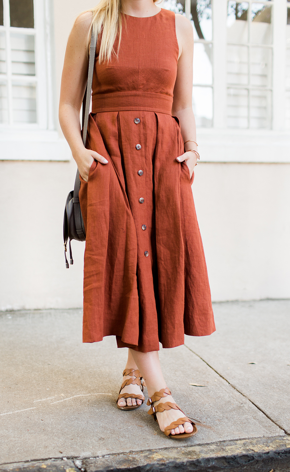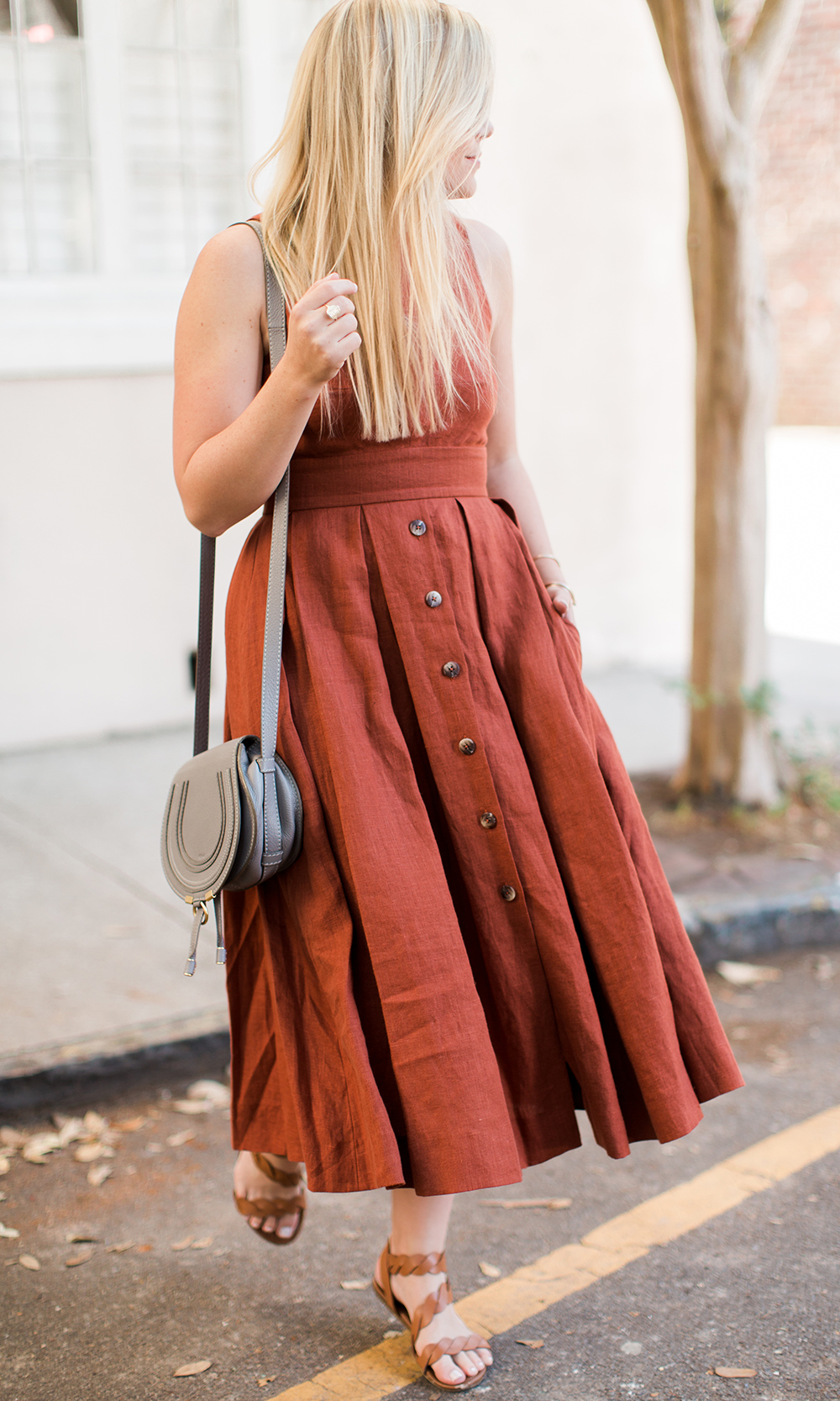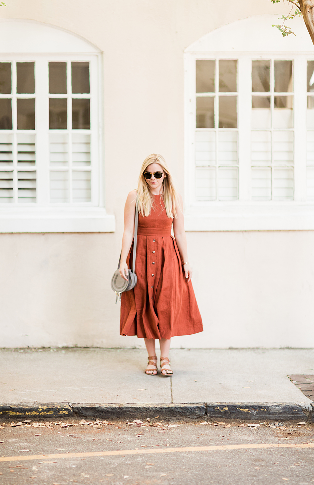 Plante Button Front Dress c/o {a similar option in other colors} | Chloe Grey Crossbody | similar Braided Sandals | Karen Walker Sunglasses