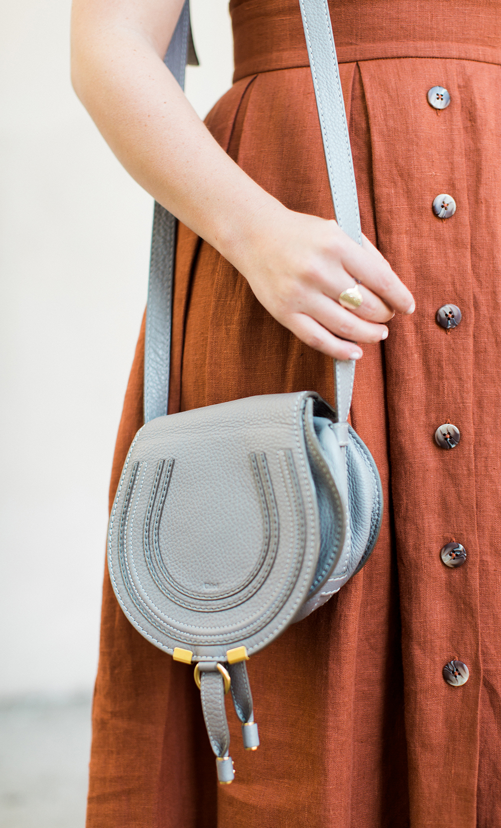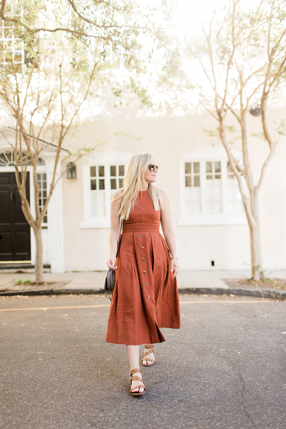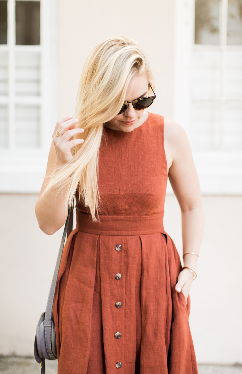 Plante Button Front Dress c/o {a similar option in other colors} | Chloe Grey Crossbody | similar Braided Sandals | Karen Walker Sunglasses