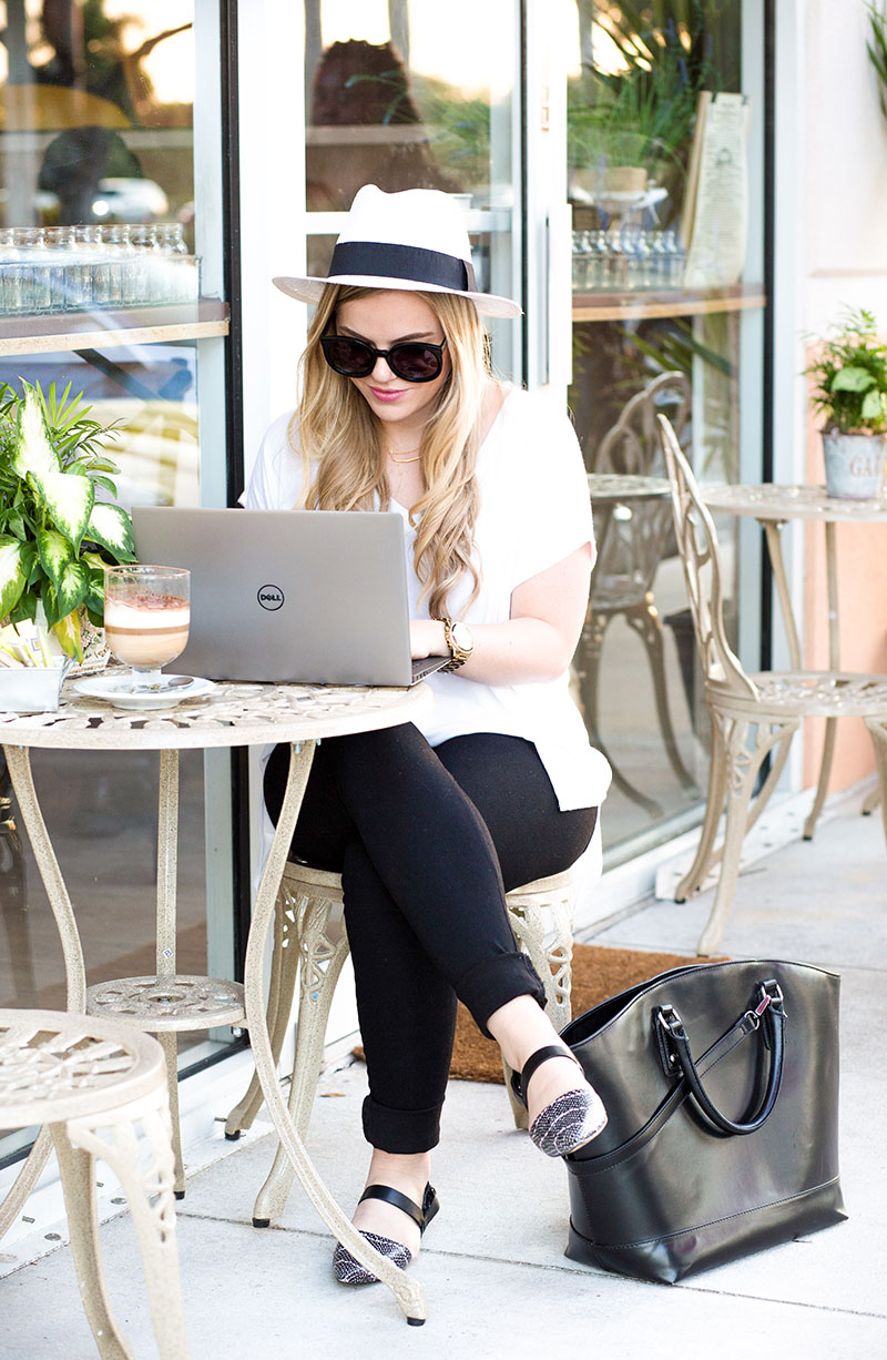 Black Denim | Express White Tee c/o | identical White + Black Fedora | Dell XPS 13 c/o | Sunnies | Marc Fisher LTD Flats c/o | similar Black Shopper Handbag