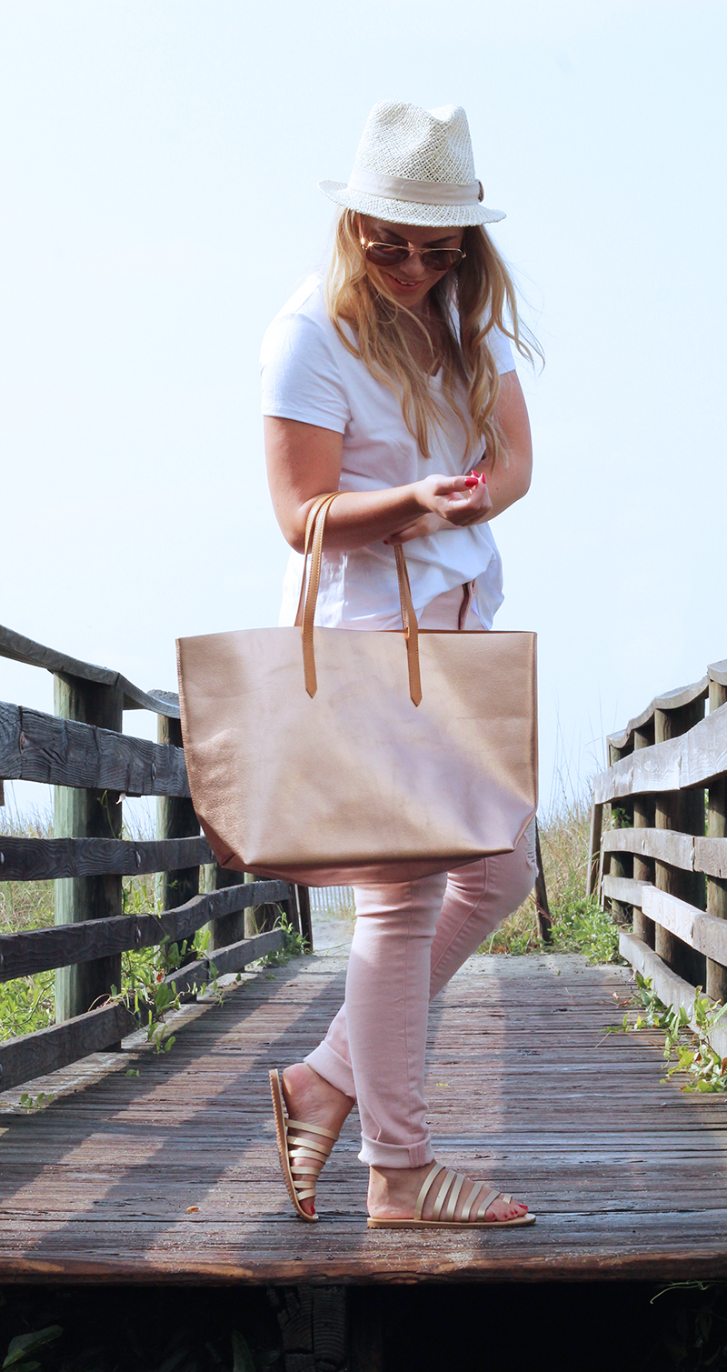 Blush Pink Denim, Rose Gold Tote, Blush Pink Woven Fedora + White Hi-Lo Tee  c/o Express | Sandals | Sunnies | Lips ‘Patina’