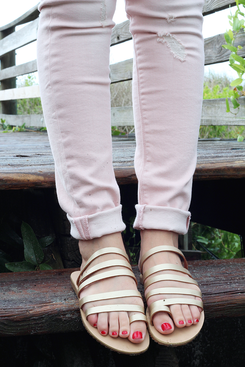 The weather in Charleston/Folly Beach was less then stellar during my trip {so so sooooo much for to come on that this week! Eeeekkk, can’t wait to share all the engagement details with y’all!}, but that didn’t stop us from hitting the beach + exploring. Even through the rain showers, gloomy fog + sand storms {or at least that’s what the wind on the beach felt like} I was able to squeeze in a couple outfits for y’all! First up – these uh-mazing distressed skinny jeans. Talk about a killer combination of things I love: distressed denim + blush pink. The stretch on these is fantastic. I opted for a casual loo by rolling up with bottoms and pairing with a soft-tee + woven fedora.
