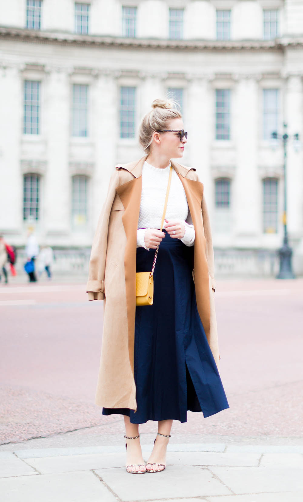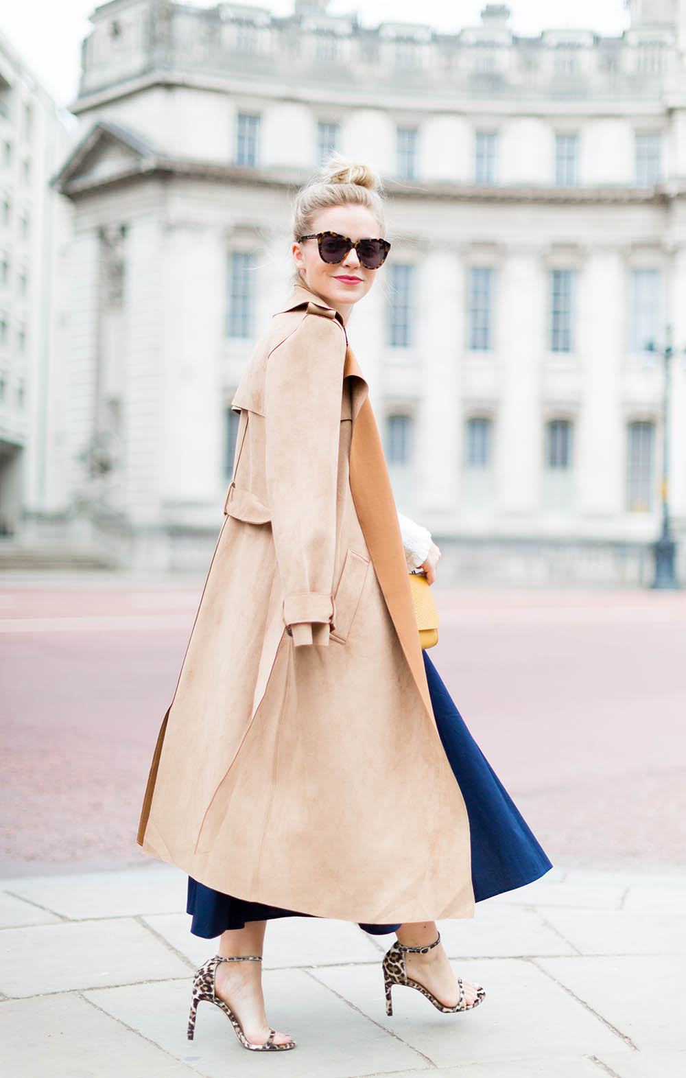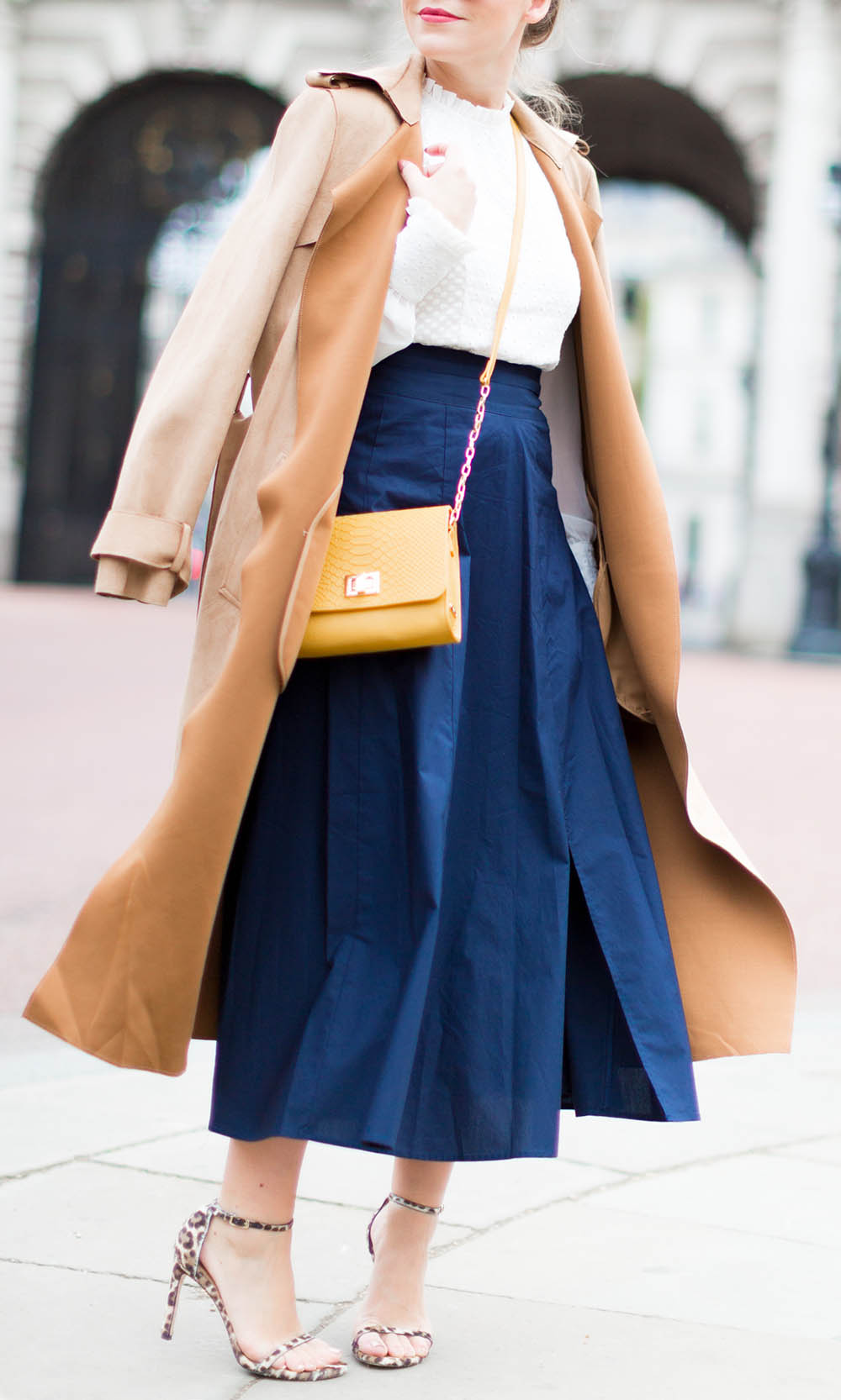 Warehouse Navy Skirt | Express Lace Top | Bebe Suede Cognac Trench | Stuart Weitzman Leopard Heels {similar here} | GiGi New York Mustard Crossbody | Karen Walker Sunglasses