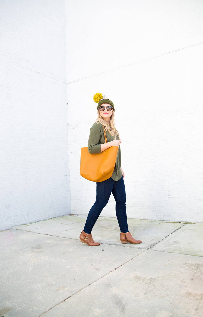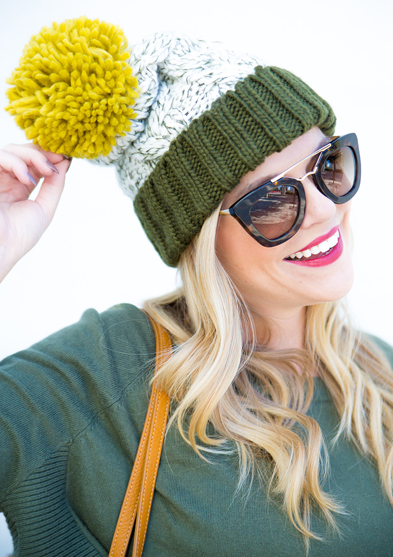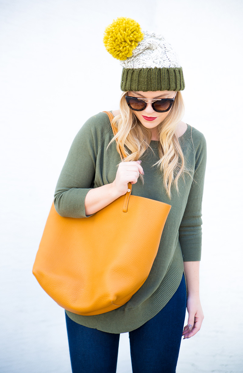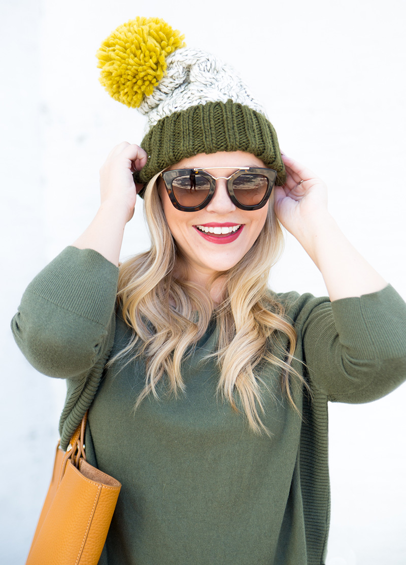 Pom Pom Beanie c/o {exact color sold out, but red version still available + only $10} | Olive Sweater | Skinny Jeans | Cognac Booties c/o Nine West | Cognac Tote c/o | Lips | Sunnies c/o DITTO {use code ‘LICP’ for a free month of designer sunglass rental!}