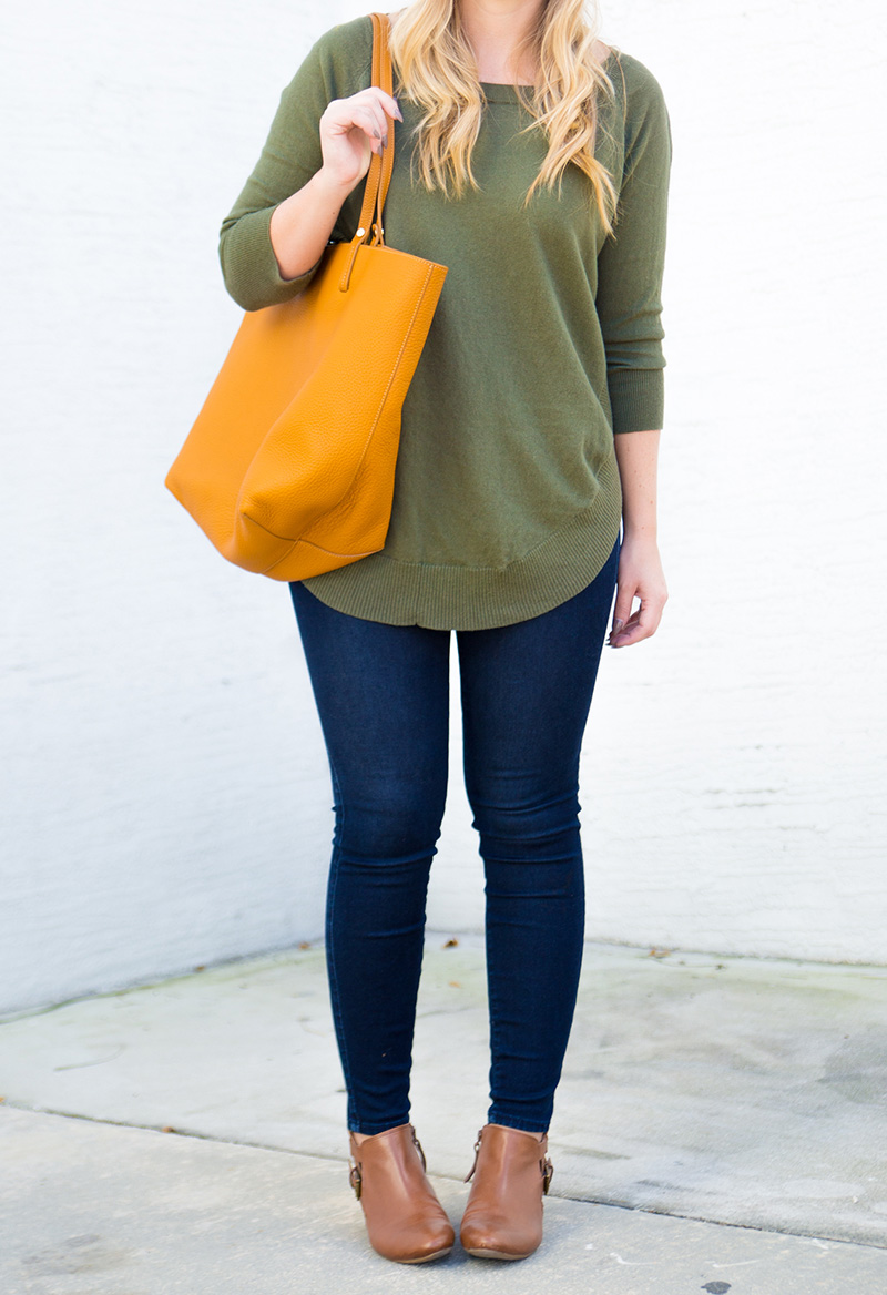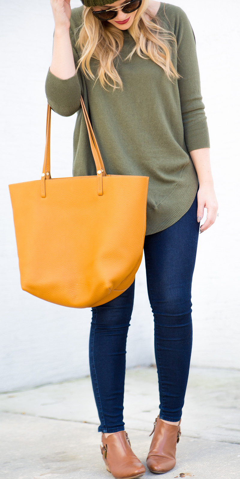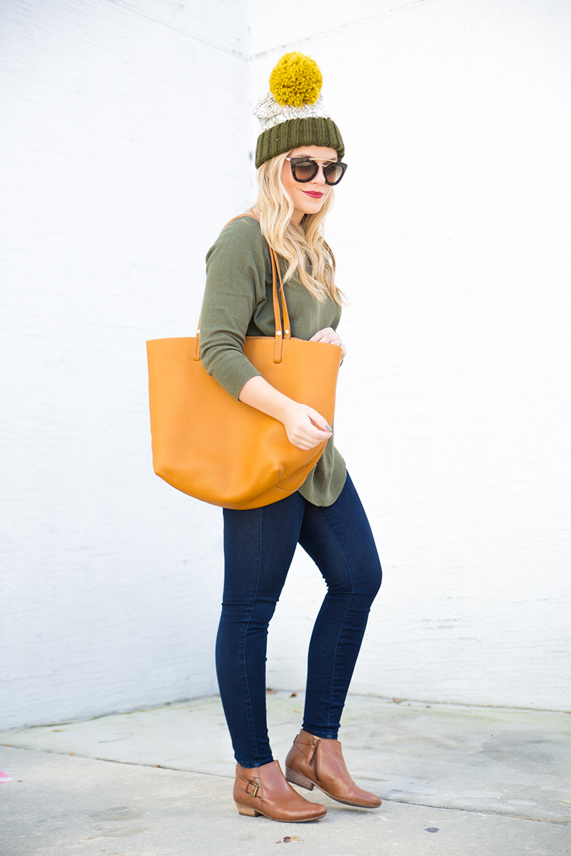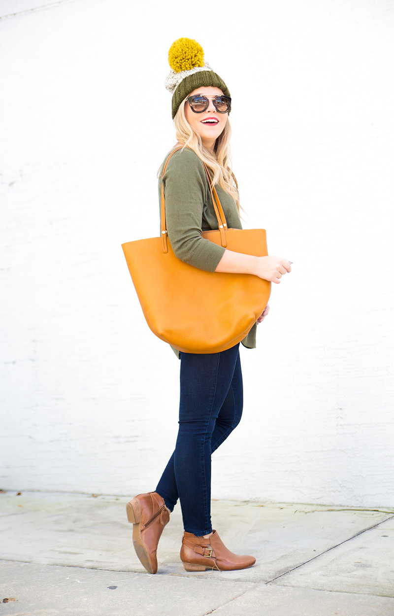 Pom Pom Beanie c/o {exact color sold out, but red version still available + only $10} | Olive Sweater | Skinny Jeans | Cognac Booties c/o Nine West | Cognac Tote c/o | Lips | Sunnies c/o DITTO {use code ‘LICP’ for a free month of designer sunglass rental!}