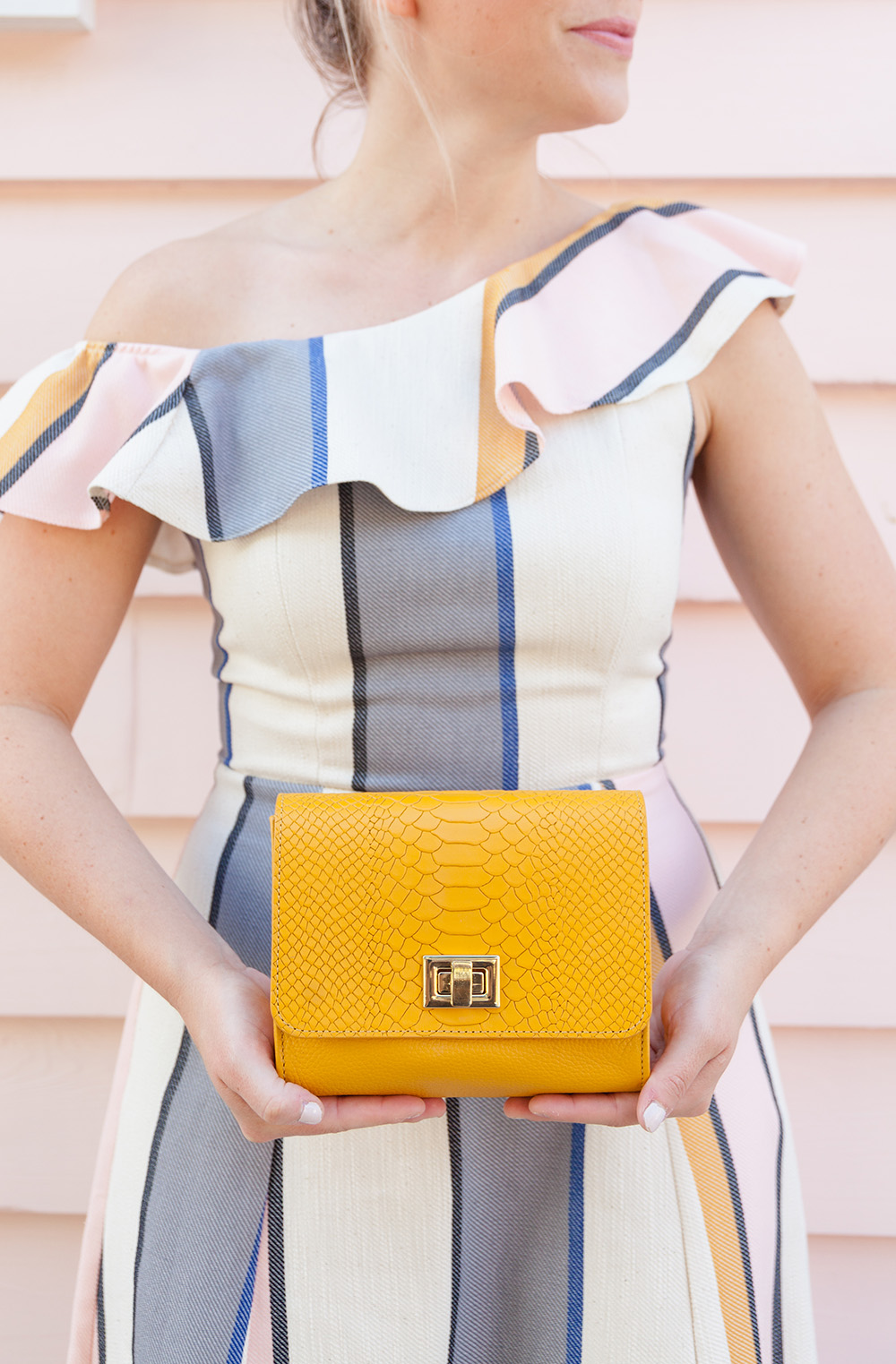 ASOS Shoulder Ruffle Sundress | Steve Madden Dusty Blue Heels | Gigi New York Mustard Crossbody {currently on sale} | similar Oversized Sunglasses {additional options below}