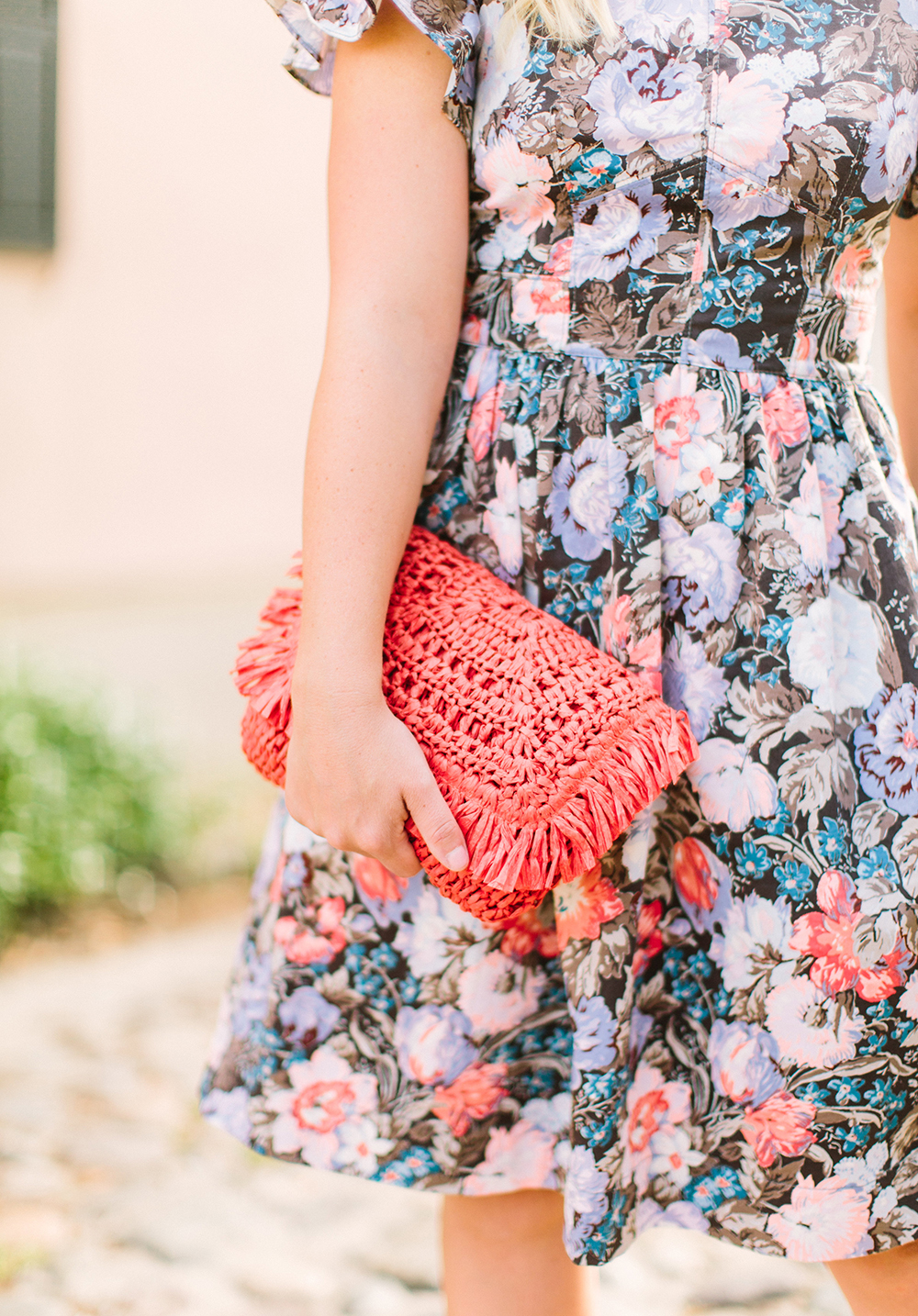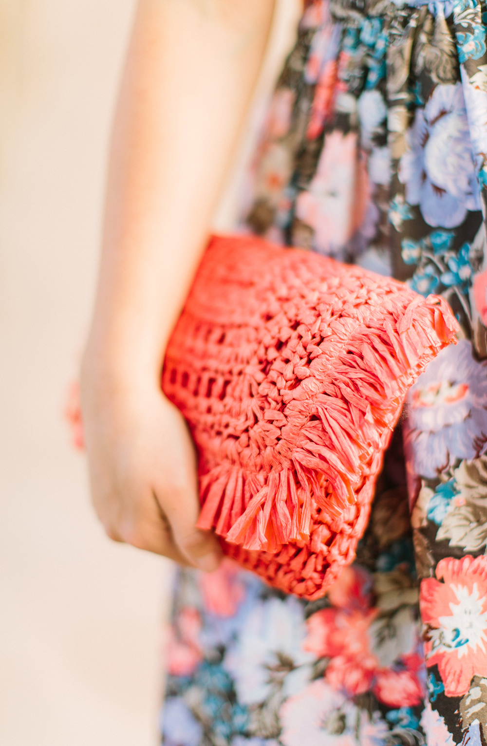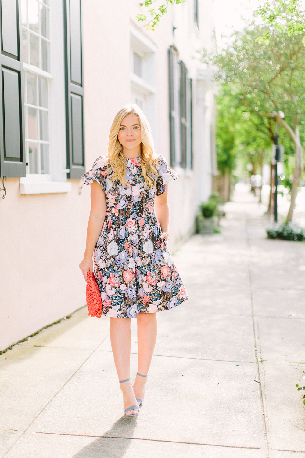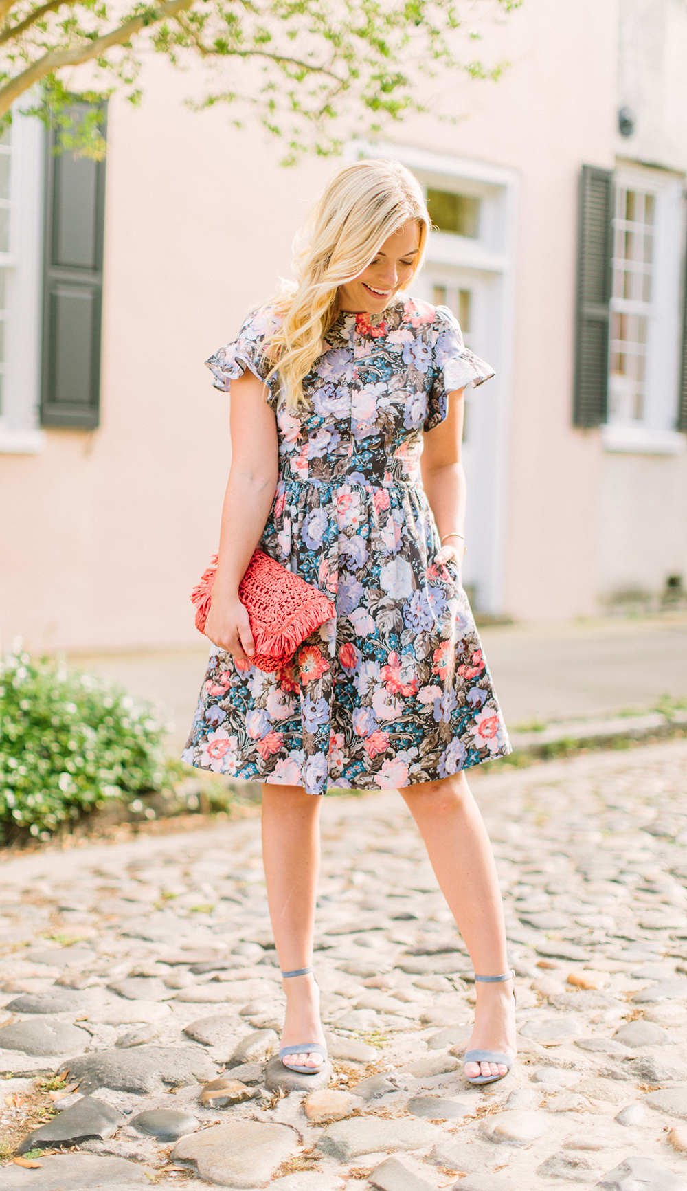 Rebecca Taylor Floral Dress c/o {wearing a size 4 for reference} | Steve Madden Blue Heels | identical Orange Straw Clutch