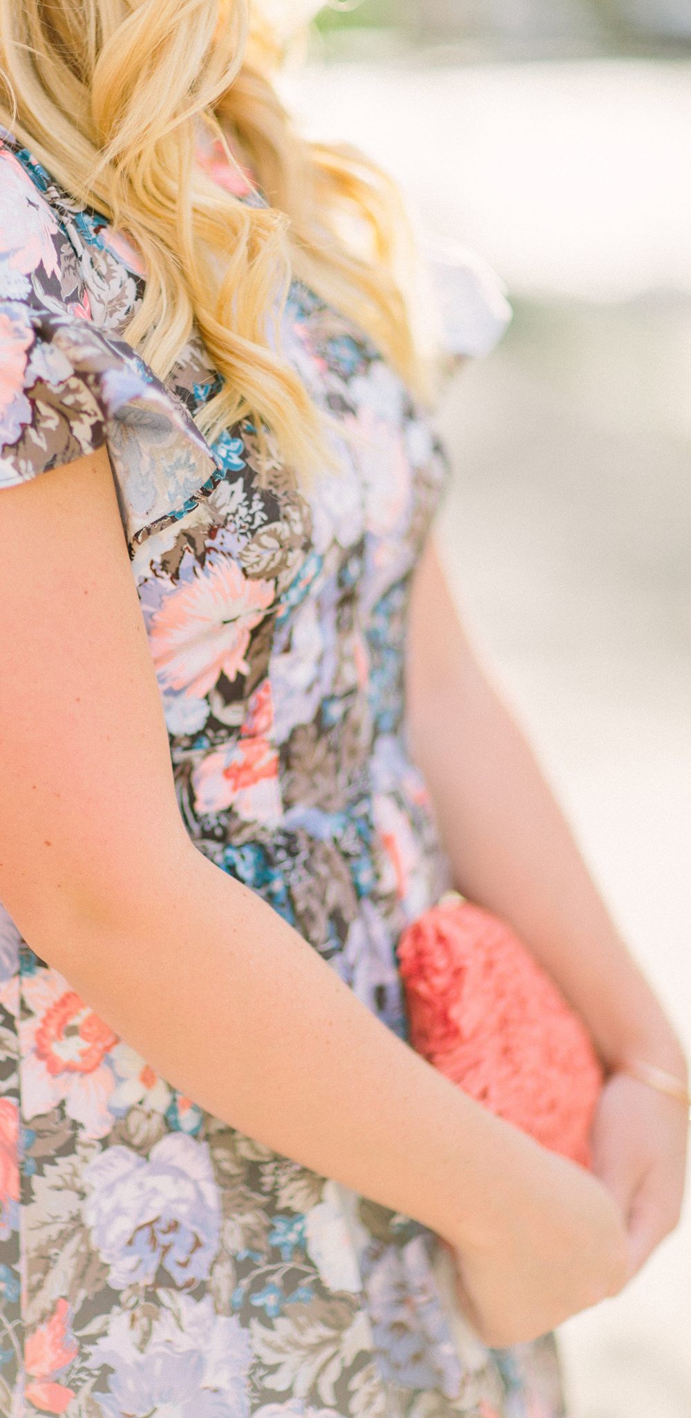 I opted to pair the colorful print with coordinating pops of blue {heels last seen styled here} + orange to play off the floral print. I feel the silhouette {along with the ruffled sleeve} and fun bow back detail allows you to be more playful with accessorizing.