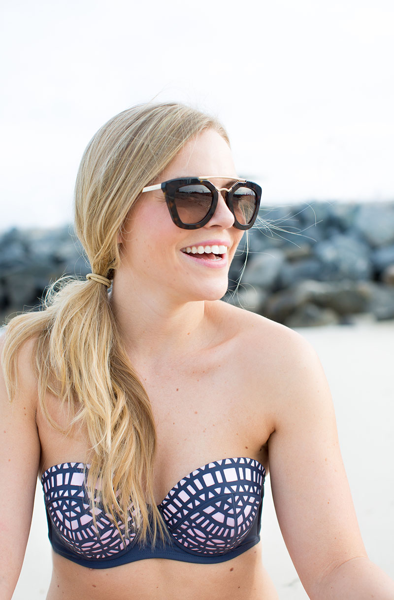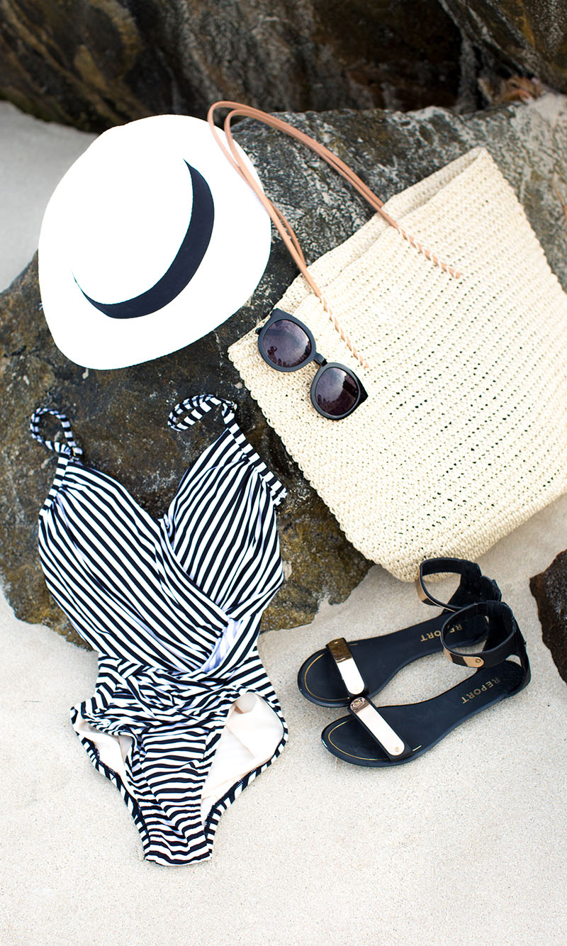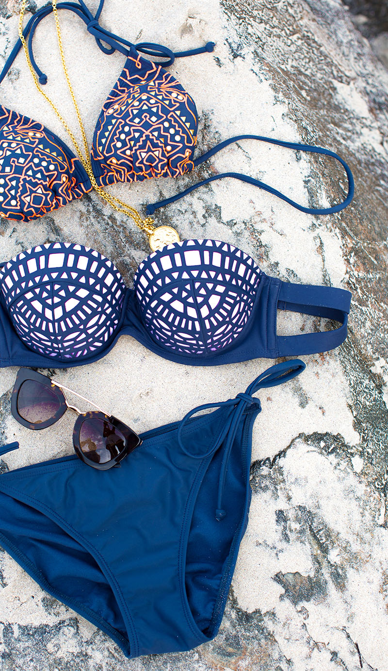 Target has always been a go-to for swimsuits for me. They’re colorful, affordable, and have a crazy good selection of varying fits/cuts. This past week I found three styles in particular that I loved. #1 the triangle top with orange + gold embellishments. Perfect for a small bust {hi, that’s me.} and less coverage for sunbathing. #2 the laser cut design grey + lilac bandeau top. Bandeaus are my comfort zone for beach days because they have fewer strings to worry about and are, again, good for a small bust and are perfect for minimizing tan lines. I also picked up a great slate grey scrunched string bottom that matched both tops perfectly. I think the scrunched look is really flattering for a larger bottom {more of a pear-shaped body type}, and it’s always a win-win when you can pair a bottom with two different tops! #3 this uh-mazing crisscross stripe one-piece. Probably one of the most flattering one-pieces I’ve ever seen. The illusion created by the stripe placement along with the overlaying fabric crisscross makes for an incredibly slimming effect – perfect for any body type. Plus the nautical stripe look is super on trend and easy to accessorize.